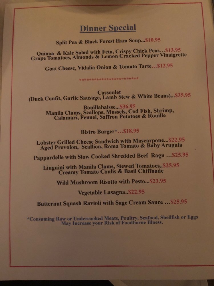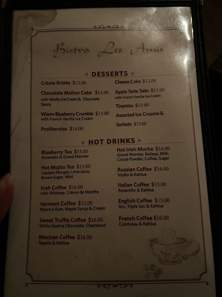 “ Been a few years so I figure it was time for an update. French onion soup remains fantastic, genuinely one of the best I've had (melted Gruyère is the best part). Tried the duck, which I overall enjoyed but thought the flavors could've meshed together better; rice was also a touch undercooked. Dessert menu had a good selection of items but execution could've been better. The texture on the blueberry crumble was a bit weird and thought it lacked a bit of flavor (granted blueberries are out of season right now). I also didn't like the texture on the apple tart, found it very mushy, but flavor-wise thought the tartness balanced the sweetness very well. Chocolate lava cake was okay, I've had better elsewhere. That being said, service was great and I appreciated how friendly and attentive our waiter was. ”